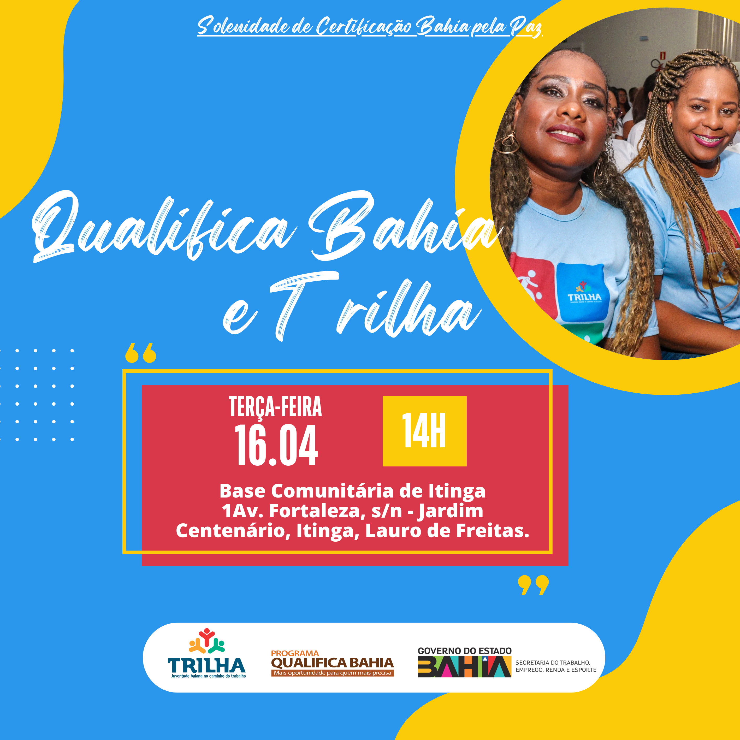 O Governo da Bahia, por meio da Secretaria do Trabalho, Emprego, Renda e Esporte (Setre) realiza a certificação de 73 jovens entre 16 a 29 anos dentro dos projetos Qualifica Bahia e Trilha, nesta terça-feira, 16, às 14h, no município de Lauro de Freitas. As ações se relacionam com o programa Bahia Pela Paz, do Governo do estado, que busca promover a cultura de pacificação, atuando na promoção da cidadania, da valorização da família e redução dos índices de violência, principalmente entre a juventude negra e periférica.