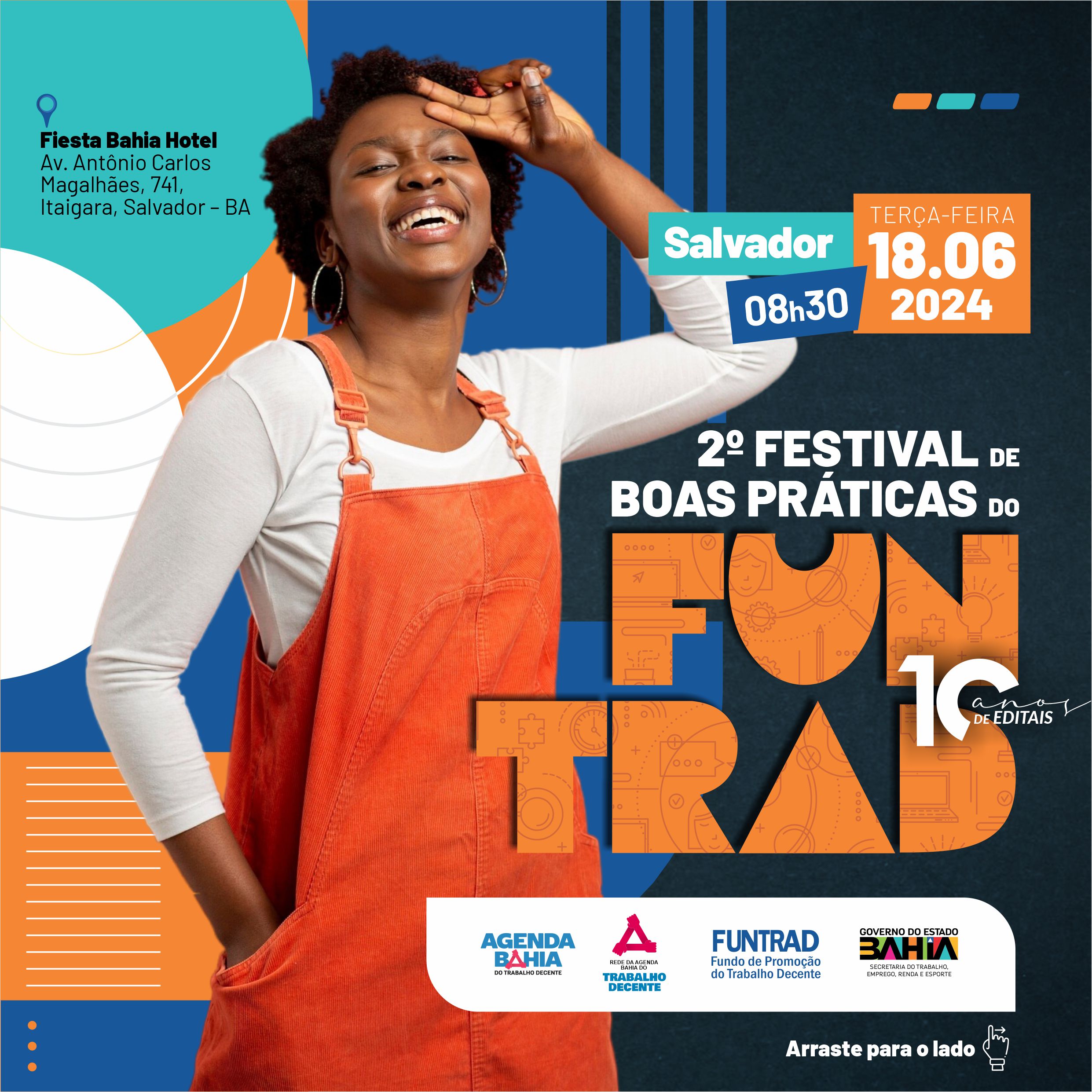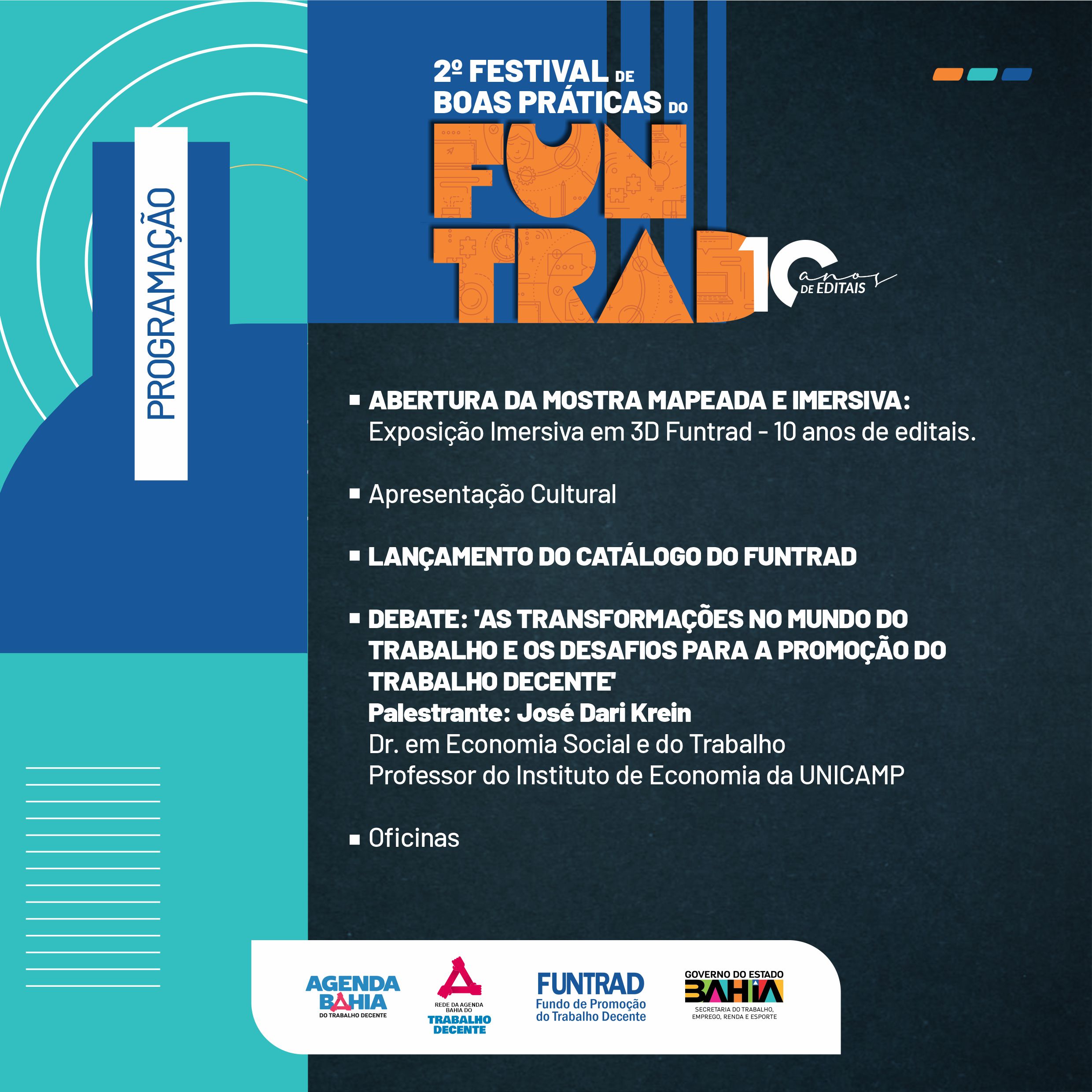 O Governo da Bahia, por meio da Secretaria do Trabalho, Emprego, Renda e Esporte (Setre), realiza o II Festival de Boas Práticas do Funtrad – Fundo de Promoção do Trabalho Decente, com programação diversificada que inclui mostra imersiva em 3D, lançamento de catálogo comemorativo aos 10 anos de editais, oficinas e conferência virtual com o professor da Unicamp, José Dari Krein, doutor em Economia Social e do Trabalho. O festival acontece no próximo dia 18/06, no Hotel Fiesta, a partir das 8h30, com acesso livre ao público interessado.