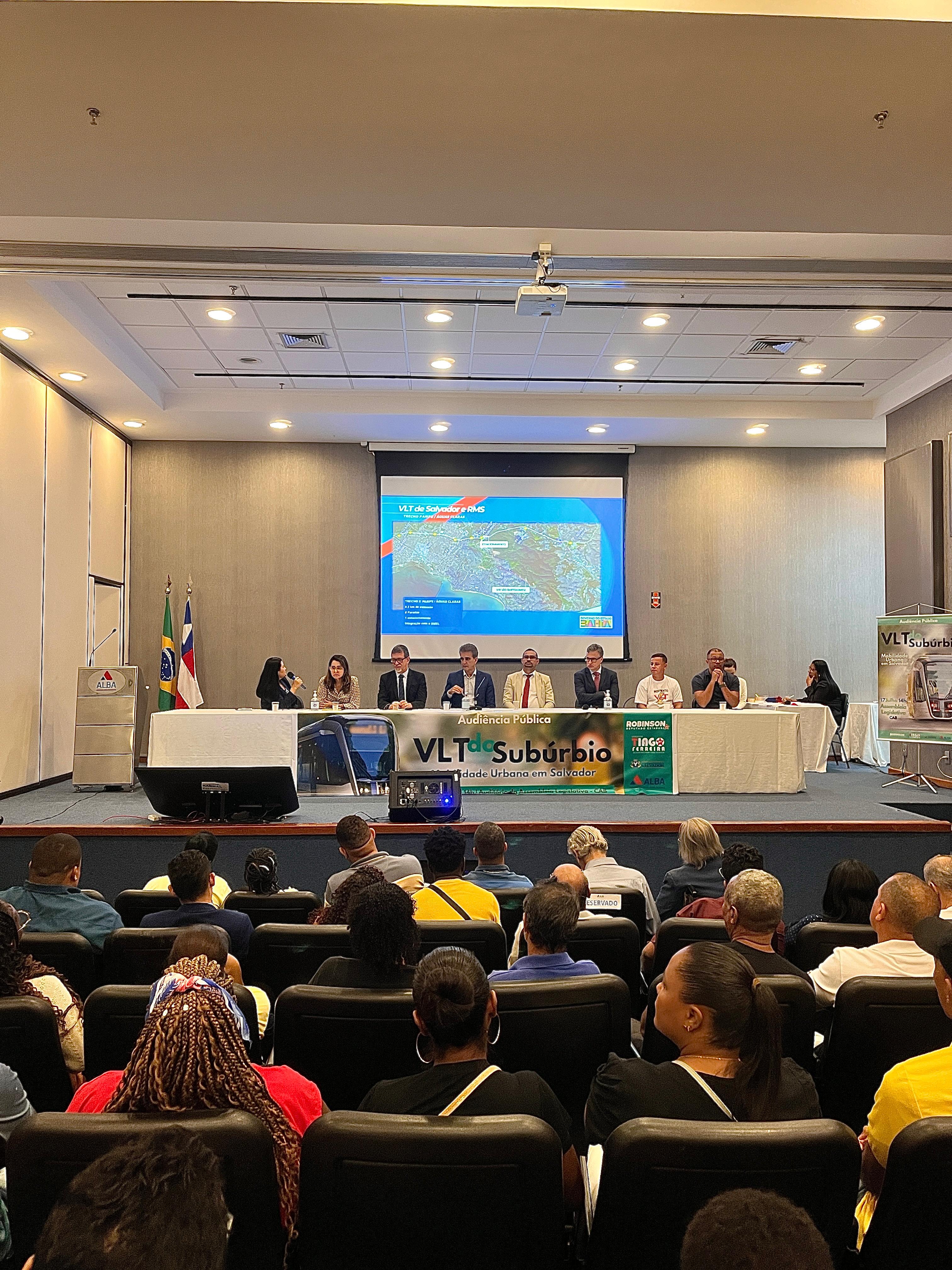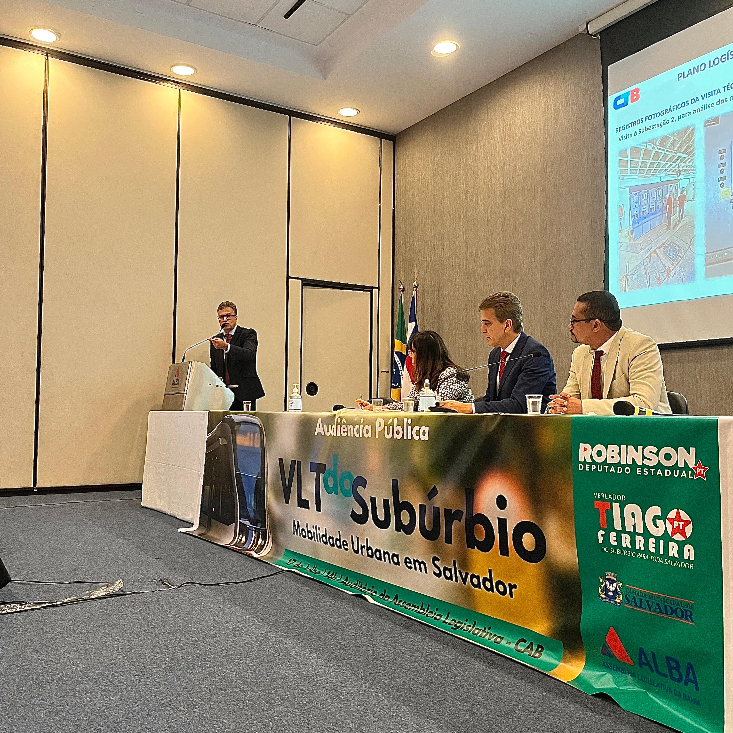 Na última quarta-feira (17) o Veículo Leve sobre Trilhos (VLT) e mobilidade urbana em Salvador foram temas da audiência pública, promovida na Assembleia Legislativa da Bahia (ALBA), que, a convite do Deputado Robinson Almeida, contou com a participação da presidente da Companhia de Transportes da Bahia (CTB), Ana Cláudia Nascimento e do diretor de obras da CTB, Eracy Lafuente.