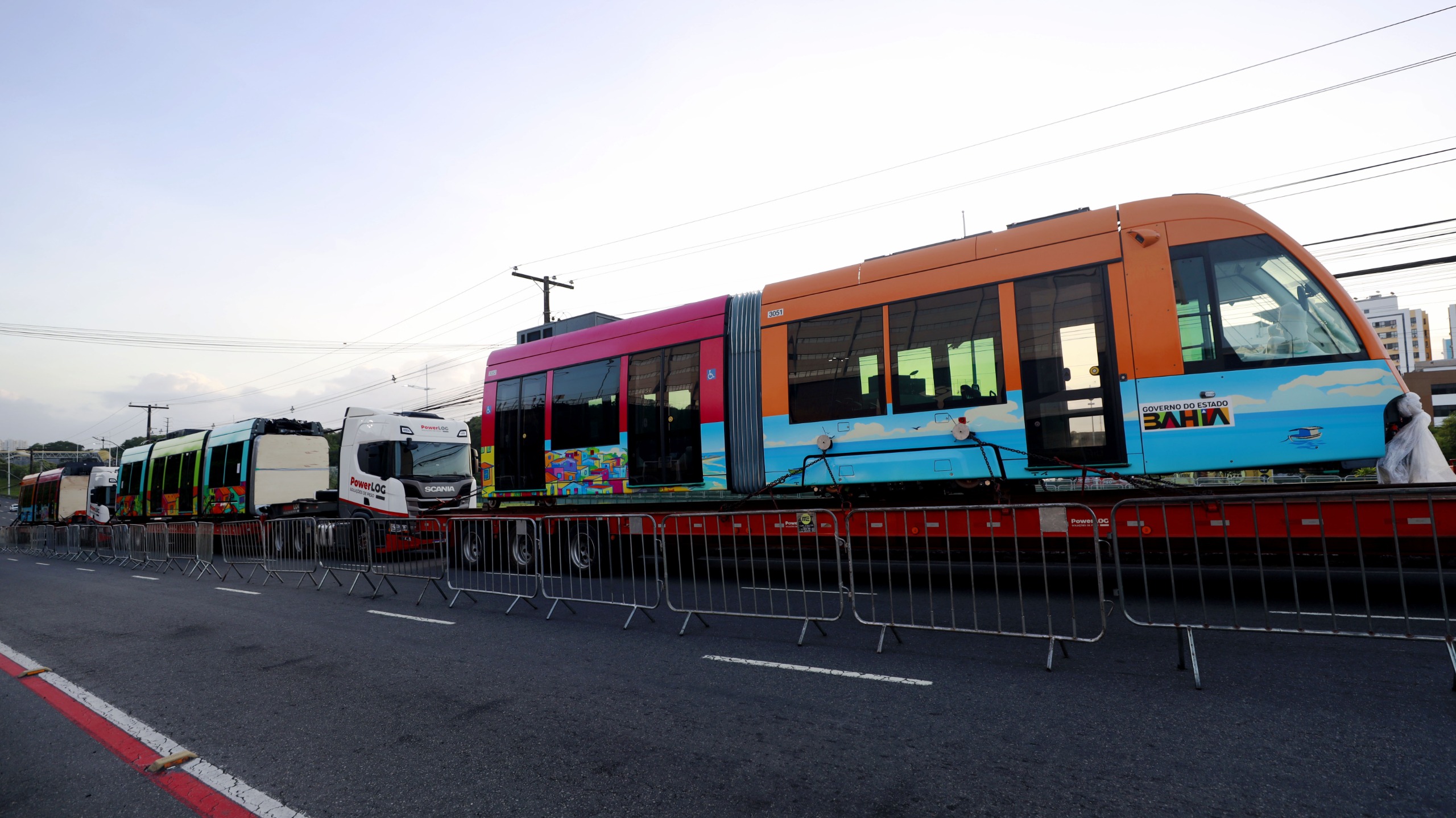 Os primeiros trens do Veículo Leve sobre Trilhos (VLT) foram apresentados à população, imprensa e autoridades na manhã desta quarta-feira (3), durante ato realizado pelo governador Jerônimo Rodrigues, na Avenida Paralela, em Salvador. A composição, formada por sete módulos, chegou à capital baiana dois dias antes do previsto.