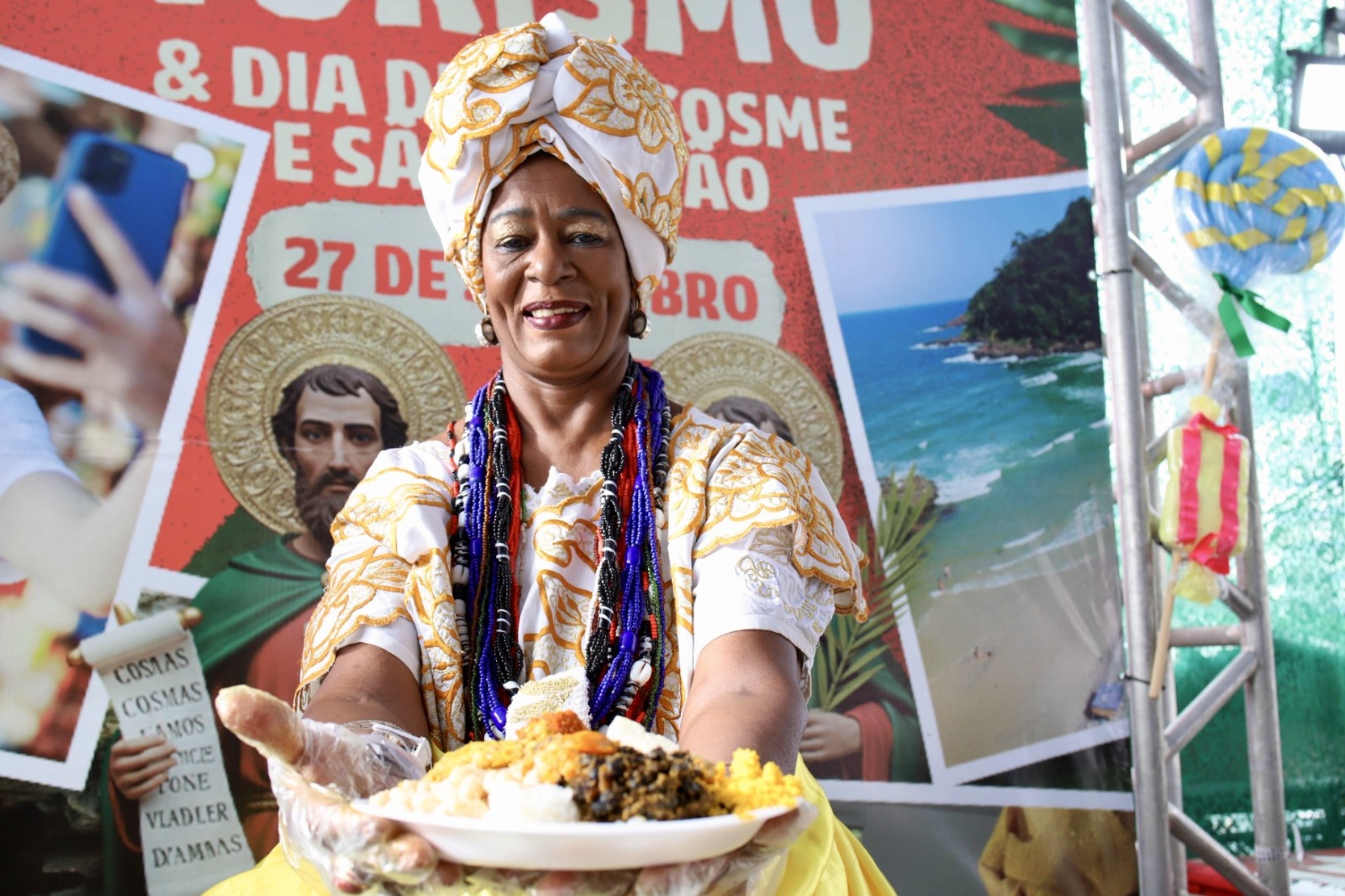 Enquanto segue a segunda etapa das obras do Governo do Estado para a requalificação da Feira de São Joaquim, na Cidade Baixa, em Salvador, o espaço foi palco, no sábado (27), do tradicional caruru de 10 mil quiabos em homenagem a São Cosme e São Damião, os santos gêmeos católicos, que nas religiões de matriz africana são representados pelos orixás Ibejis. O evento marcou a comemoração pelo Dia Mundial do Turismo. A iniciativa dos feirantes teve o apoio da Secretaria de Turismo (Setur-BA), por meio do projeto Agô Bahia, que aproveitou para celebrar a data com empresários e profissionais do setor, na festa religiosa e gastronômica afro-baiana.