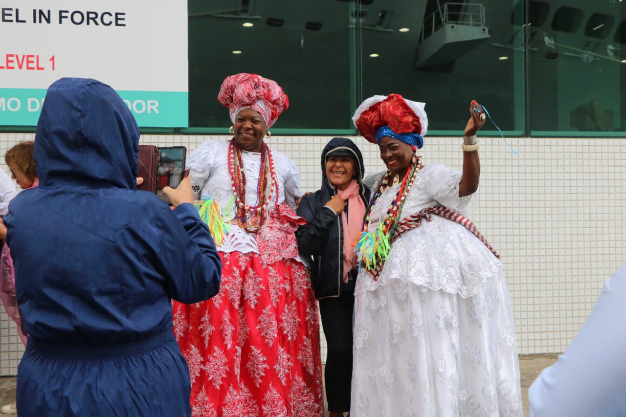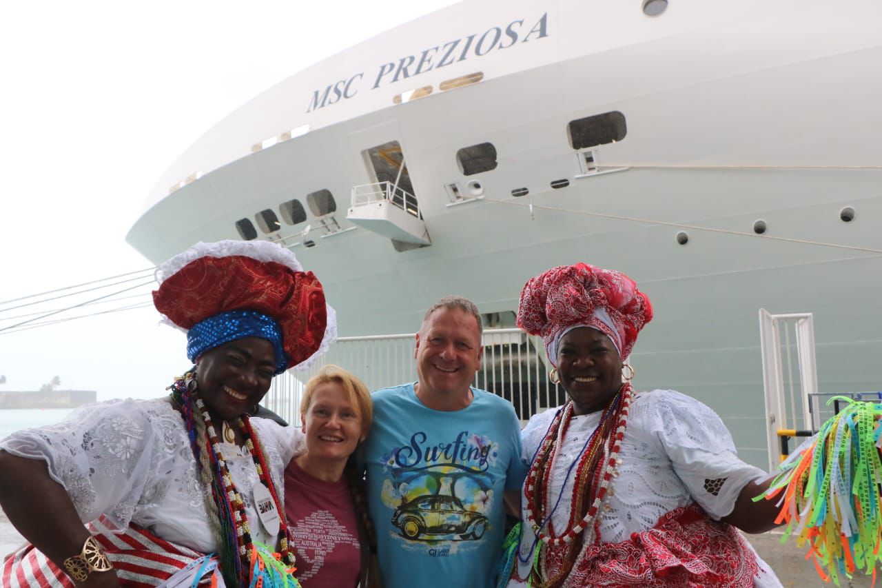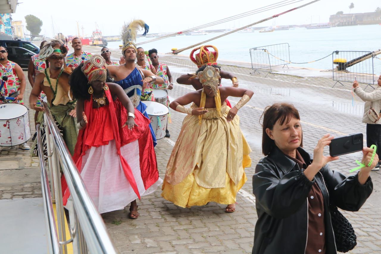 O navio MSC Preziosa atracou no Porto de Salvador, na manhã desta quarta-feira (22), vindo de Gênova, na Itália. É a primeira embarcação de grande porte da temporada de cruzeiros na Bahia (2025/2026), com capacidade para 4,5 mil pessoas, entre passageiros e tripulantes. Eles tiveram receptivo especial da Secretaria de Turismo do Estado (Setur-BA), reunindo baianas típicas, grupo de percussão afro e representação de orixás. Os cruzeiristas entraram no clima de festa, mesmo com a chuva fina que caía no momento.