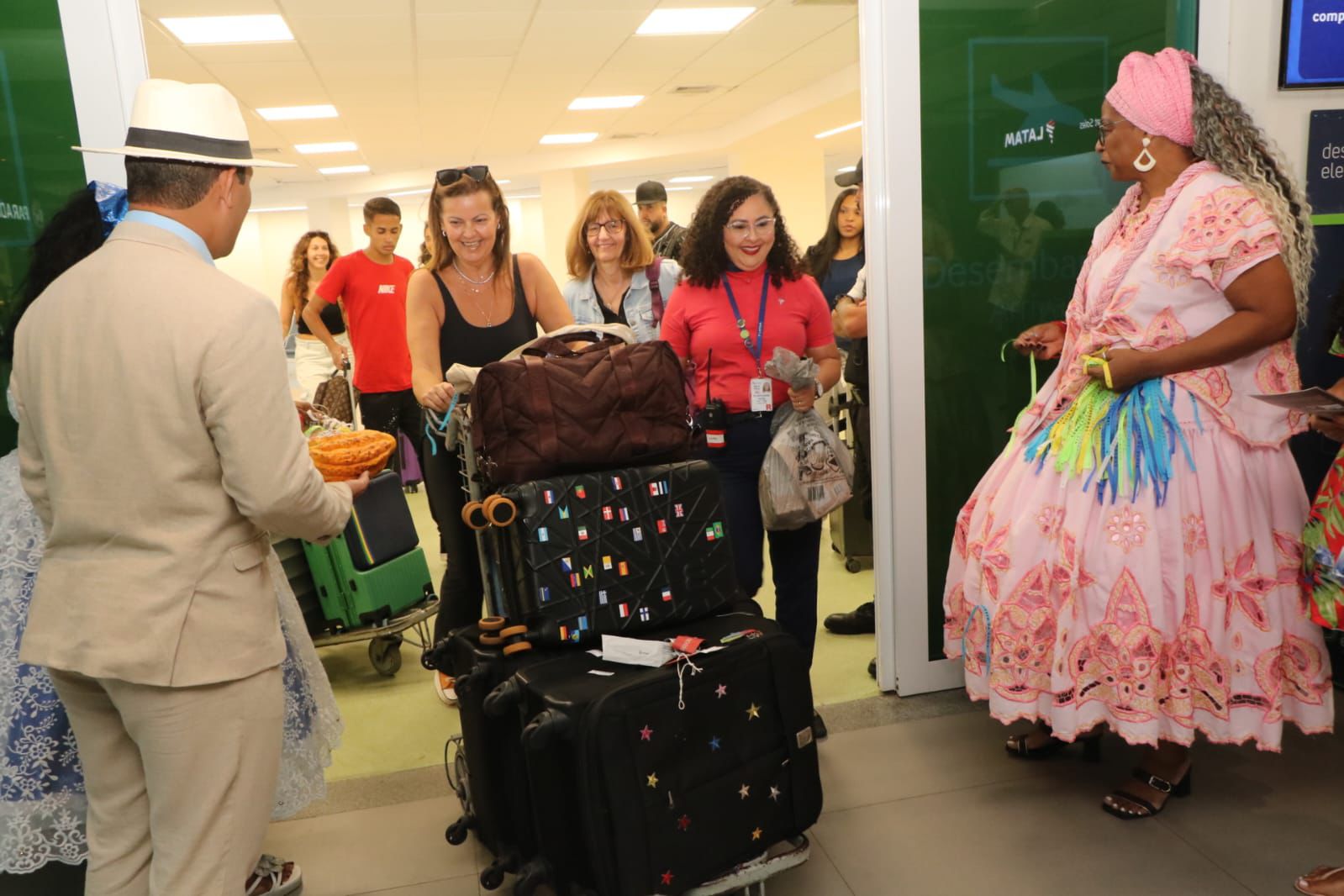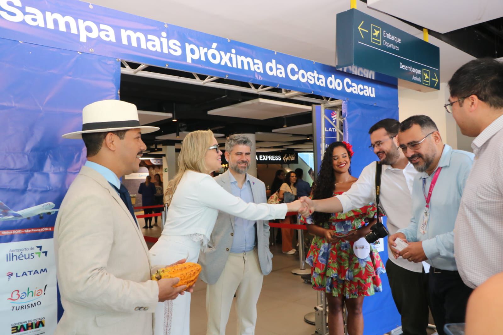 O voo regular da Latam, que liga o aeroporto de Congonhas (São Paulo) a Ilhéus, na Costa do Cacau, foi inaugurado na tarde de domingo (26), em solenidade na área de check-in do aeroporto da cidade baiana. Ela reuniu representantes do Governo do Estado, da companhia aérea e da Socicam, empresa responsável pela administração do terminal ilheense, que firmaram uma parceria para a consolidação da rota, antes sazonal. O ato foi acompanhado pelo trade turístico e teve receptivo da Secretaria de Turismo (Setur-BA), com baianas típicas e os personagens Gabriela e Nacib, criados pelo escritor Jorge Amado, que simbolizam Ilhéus.