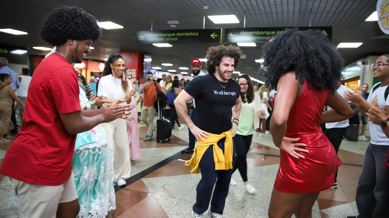 O clima contagiante do Carnaval da Bahia animou famosos e turistas que desembarcavam no Aeroporto de Salvador, na quinta-feira (12), entre eles, celebridades das artes e do jornalismo. O receptivo especial do Governo do Estado, organizado pela Secretaria de Turismo (Setur-BA), deu as boas-vindas aos visitantes, com minitrio, baianas típicas, fitdance e a representação do afoxé Filhos de Gandhy, além da distribuição de colares e fitinhas do Senhor do Bonfim.