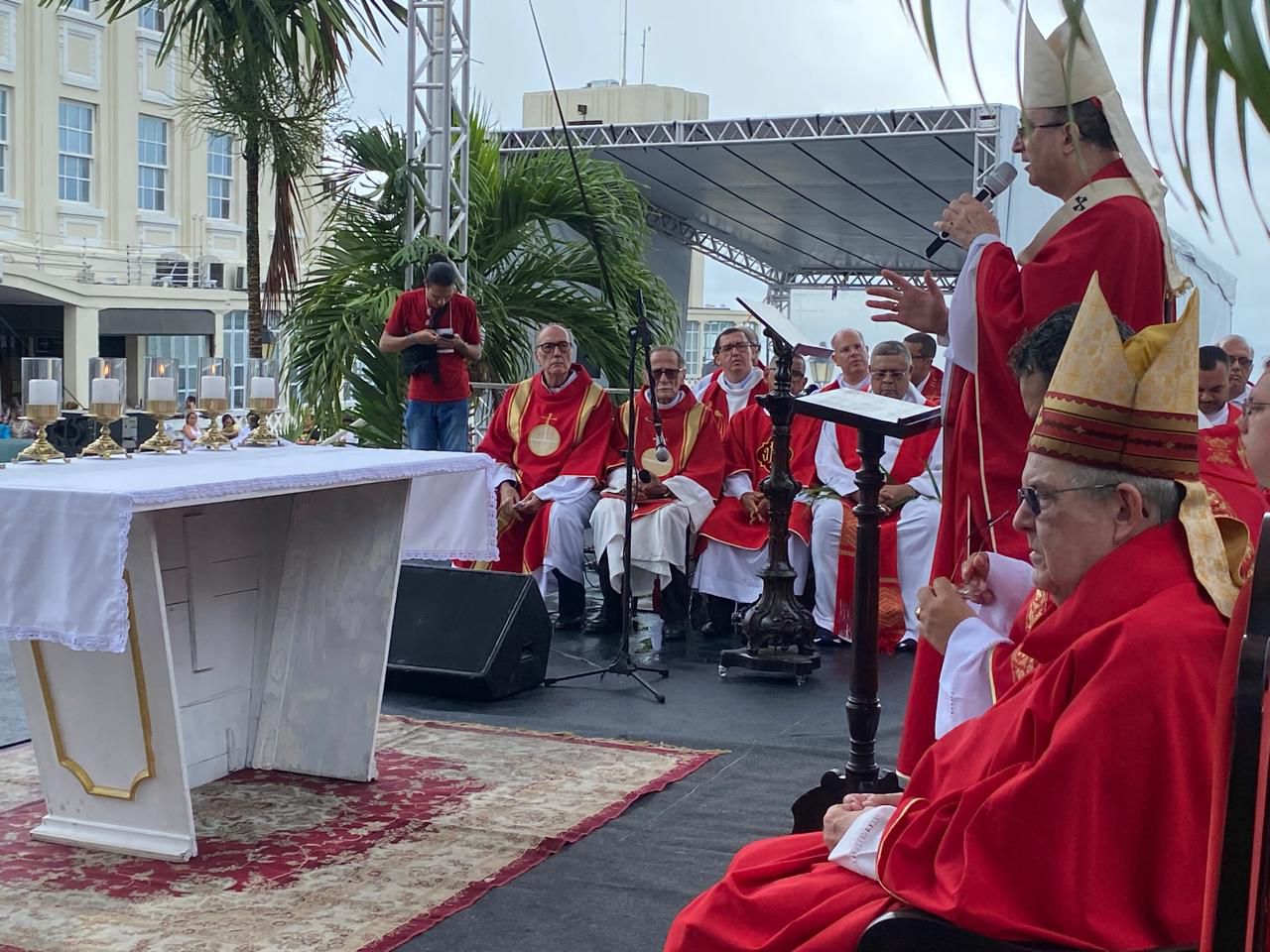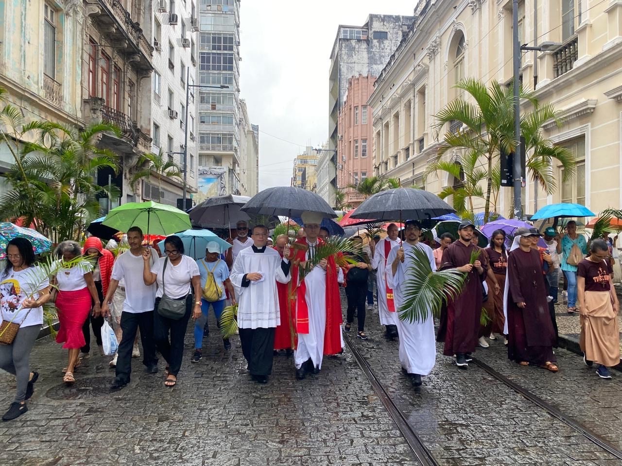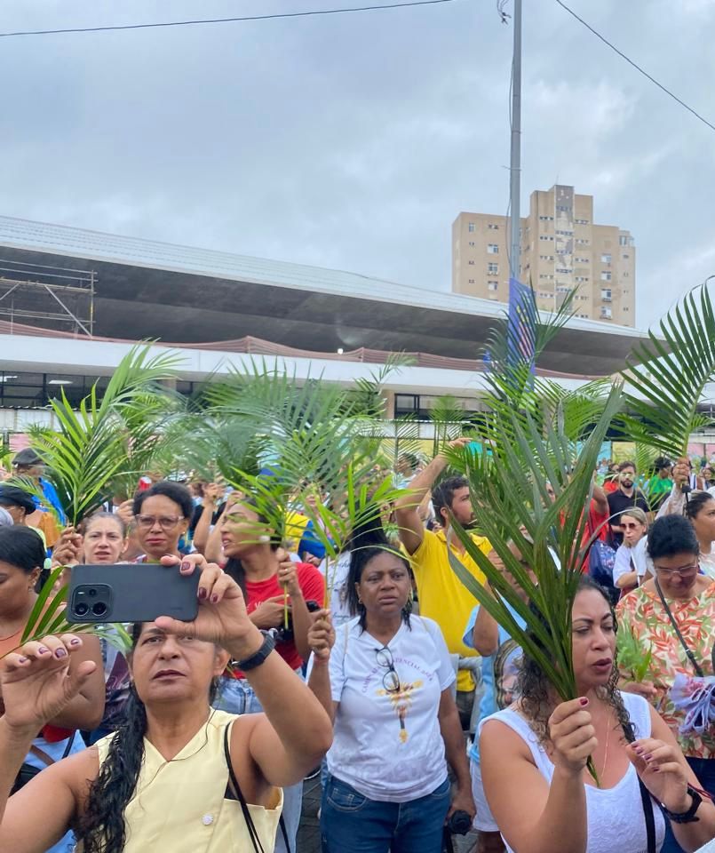 A praça do Campo Grande, no centro de Salvador, foi o ponto de partida das celebrações do Domingo de Ramos (29), que mesmo com chuva reuniu uma multidão de fiéis. A data recorda a entrada triunfal de Jesus em Jerusalém, quando ele foi acolhido pelo povo com ramos nas mãos, simbolizando reconhecimento e fé. Ela marca o fim da Quaresma e o início da Semana Santa, que culmina no Domingo de Páscoa.
